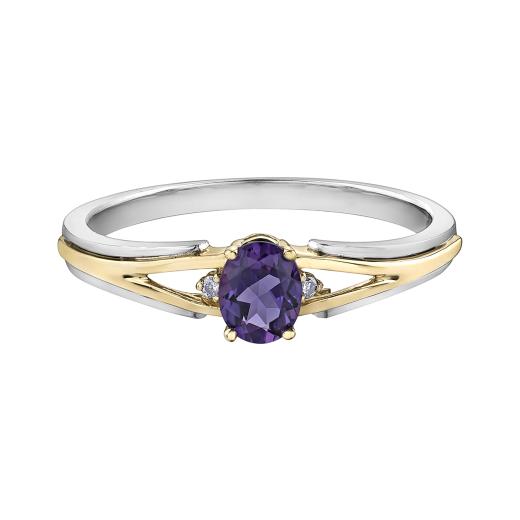 This modern yet classic 10k white and yellow gold ring is sure to become a favourite item in your jewellery collection. This item is perfectly adorned with a genuine amethyst which is the birthstone for February. If you are looking for something stunning, order this for yourself or someone you love today!