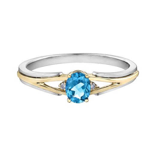 This modern yet classic 10k white and yellow gold ring is sure to become a favourite item in your jewellery collection. This item is perfectly adorned with a genuine blue topaz which is the birthstone for December. If you are looking for something stunning, order this for yourself or someone you love today!