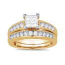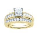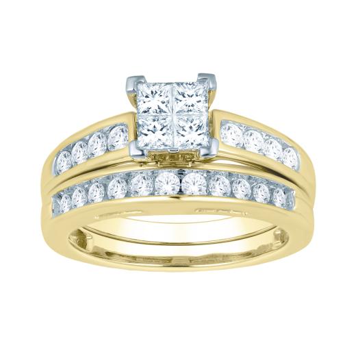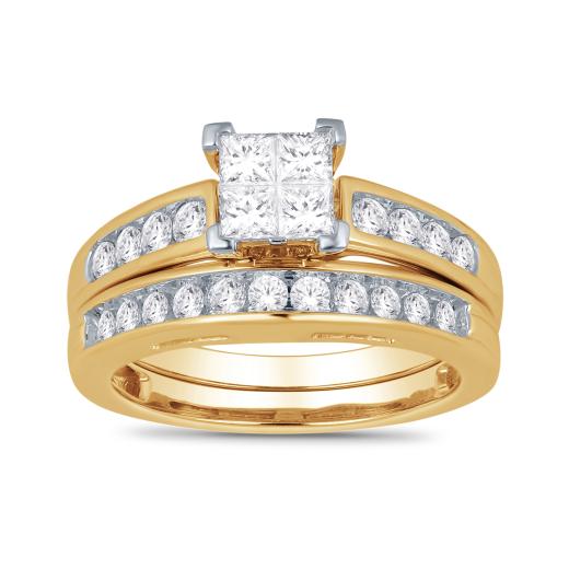 This 1.00ctw princessa bridal set in 14k yellow and white gold delivers a beautiful modern look. Designed with a quartet of invisible set princess cut diamonds at its centre, the sparkling bridal ring is designed with round channel set diamond along the shoulders. A perfectly matching wedding band with round diamonds along the band completes this bridal look.