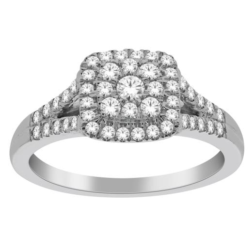 This classic ring is the perfect staple piece for everyday wear. It features a squared composite of sparkling diamonds set in beautiful 10K white gold. The split shank band is studded with diamonds for extra shimmer.