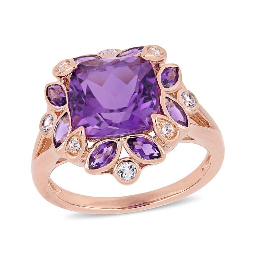 This stunning amethyst, African-amethyst and white topaz mosaic halo ring is crafted in rose gold plated sterling silver and features a cushion-cut, prong-set African-amethyst at the center with eight marquise-cut, bezel-set African-amethysts with eight round-cut, bezel and prong-set white topaz set together in a unique marquise floral halo design. This gorgeous gemstone ring is sure to be a standout addition to any jewelry collection. Coordinate this ring with any ensemble and instantly add a touch of color and elegance to your look.