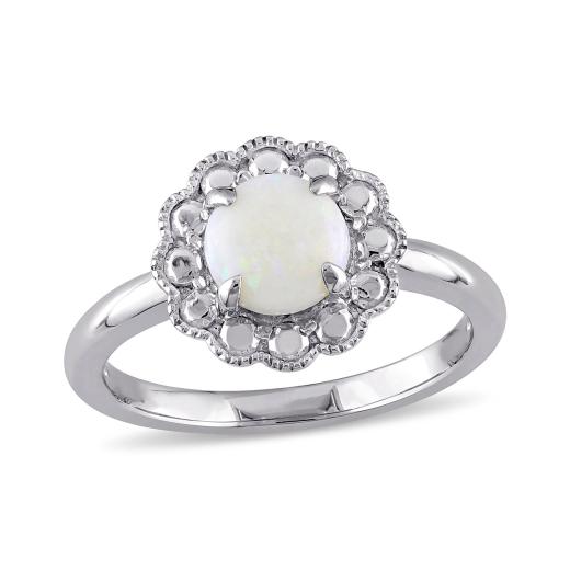 The pretty shade of the October birthstone sparks radiance when worn. The halo illusion surrounding the round cut opal gives a royal appearance. This ring is crafted in 10k white gold and is completed with a milgrain finish.