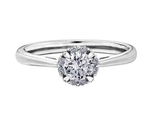 Captivate her with this adoring .35ctw Glacier Fire Canadian Diamond bridal ring in 14k white gold. With a radiant .30ct Canadian diamond at its centre, a delicate halo of round diamonds add the perfect touch of sparkle to complete this romantic look.