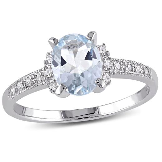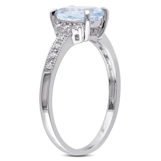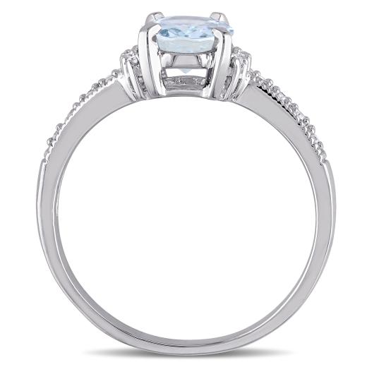 This graceful ring features an oval checkerboard-cut aquamarine center stone and round white diamond side stones. The ring is crafted of fine sterling silver with a high polished finish.