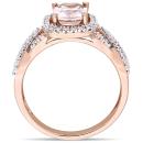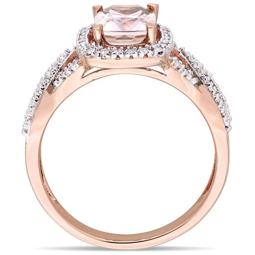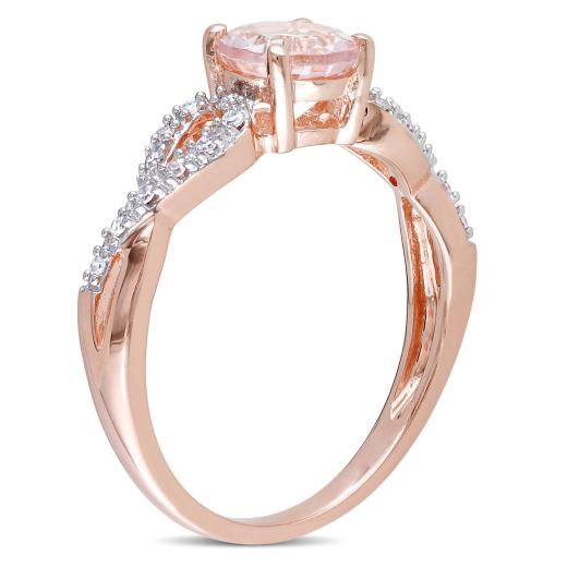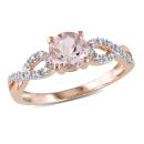This pretty ring features a round-cut morganite center stone with diamond side stones set on a braided design. The ring is crafted of 10-karat rose gold with a high polish finish.