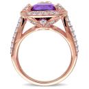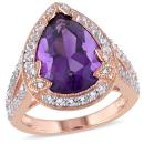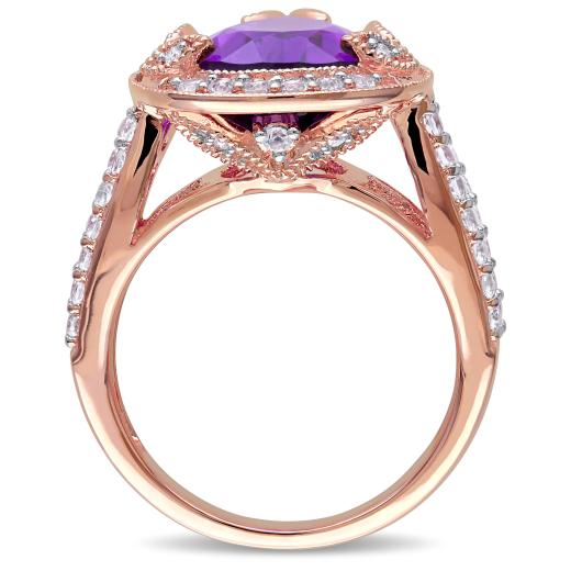 This cocktail ring from our Collection features a pear-cut African amethyst center stone surrounded by a halo of round-cut white topaz and ten round white diamond side stones. This stylish ring is crafted in rose plated silver and is enhanced with a milgrain finish.