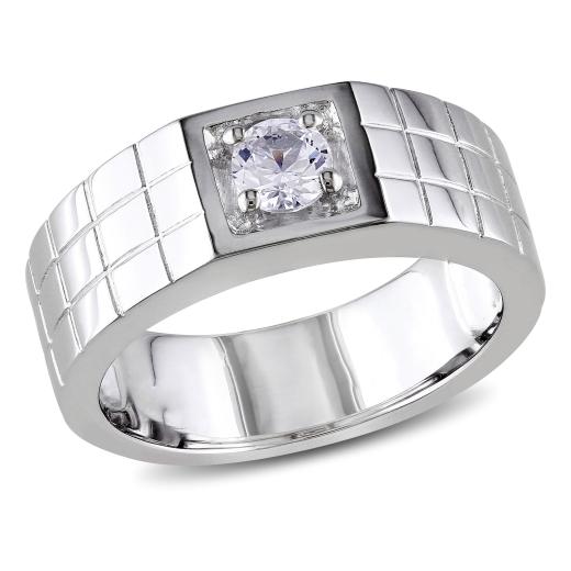 This gorgeous ring features a round-cut Created white sapphire set in sterling silver. This elegant ring is enhanced with a high polish finish.