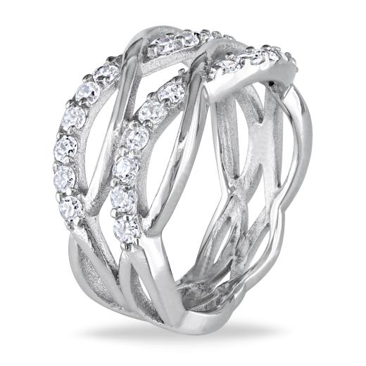 This beautiful ring is made with round-cut white cubic zirconia gemstones set in sterling silver. The fancy ring glimmers with high polished finish.