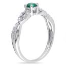 This gorgeous ring feature a round created emerald center stone with diamond side stones forming an infinity motif. The ring is set in polished sterling silver.