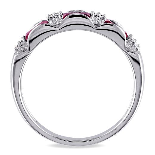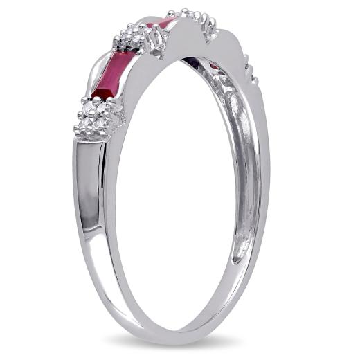 This brilliant eternity ring features baguette-cut ruby center stones and round white diamond side stones set in 10-karat white gold. This charming ring is enhanced with a high polish finish.