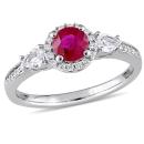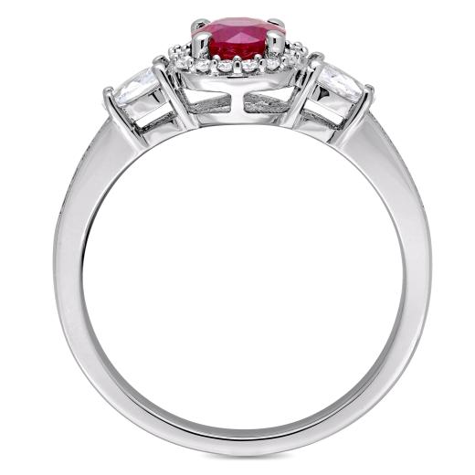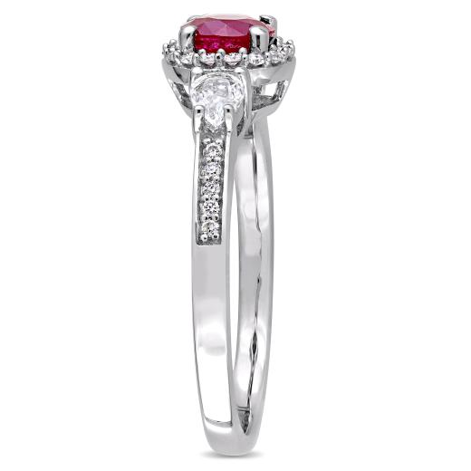 This stunning three-stone engagement ring is crafted in 14-karat white gold and features a round-cut ruby with two pear-cut white sapphires and 26 round-cut, prong and pave-set diamond along the band. This modern and sophisticated design is a perfect choice for a woman with an elegant and sophisticated style with a modern flare. Choose this style for your bride-to-be as you celebrate this special milestone in your lives together.