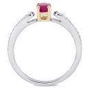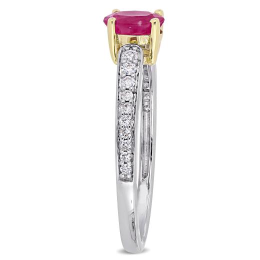 This stunning ruby and diamond engagement ring is crafted in lustrous 10-karat white gold with yellow prongs and features an oval-cut, prong-set ruby at its center along with 20 round-cut, pave-set diamonds adding shimmer along the band. The ring has been crafted to perfection and enhanced with a high polish finish. Whether worn as an engagement ring or simply a stunning new gemstone and diamond addition, this ring is sure to make a valuable addition to any jewelry collection. A perfect gift for that special July birthday in your life.