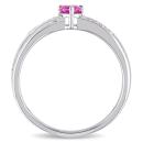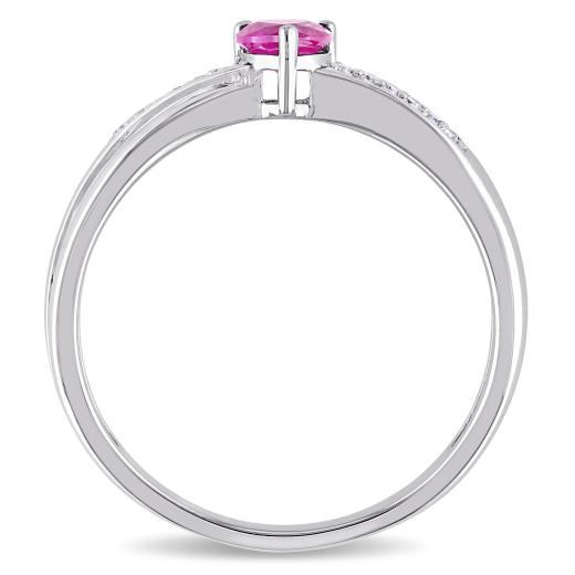 This dazzling ring features a heart-cut ruby center stone and round white diamond side stones set in sterling silver. The ring is enhanced with high polish finish.