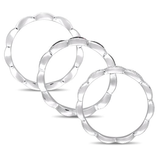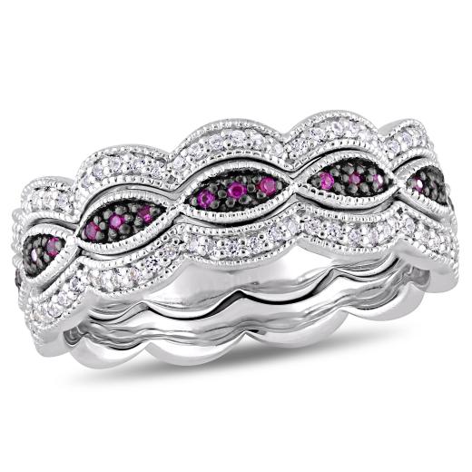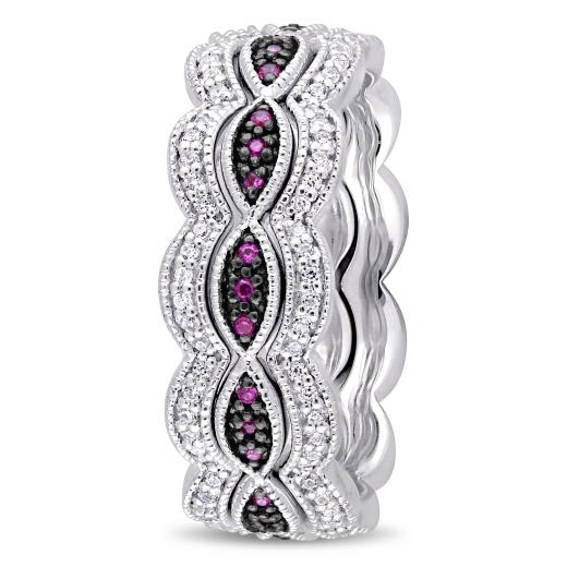 This contemporary stacked infinity curve ring set is crafted in sterling silver with black rhodium and features 33 round-cut, pave-set glistening created rubies set in an infinity design with 132 round-cut, pave-set lustrous created white sapphires. This ring portrays a feminine and graceful charm to it without being overdone. It is perfect for all dressy occasions and even as an everyday statement piece.