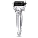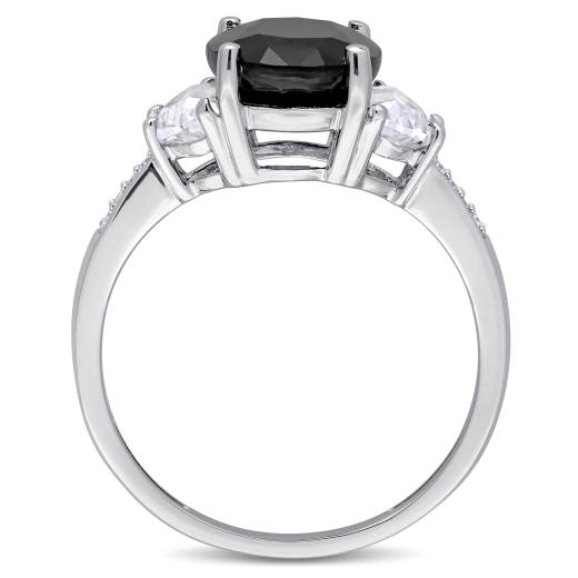 This flattering engagement ring is crafted in sterling silver and features a stunning black sapphire between two moon shape white sapphires and eight diamonds along its shank. It is perfect for all dressy occasions and even as an everyday statement piece.