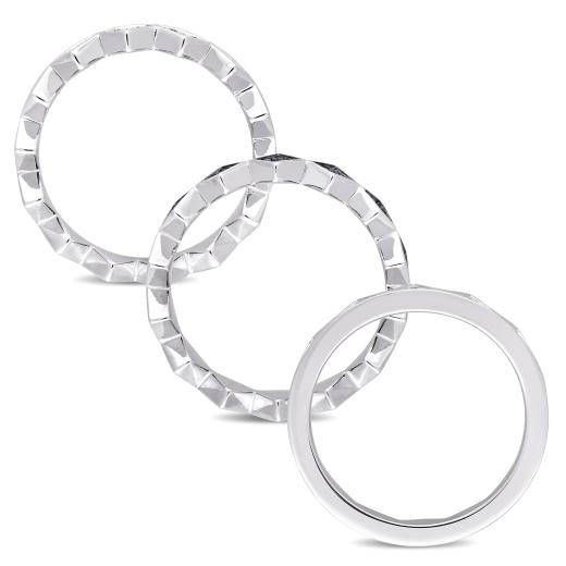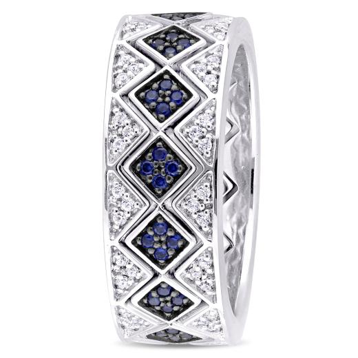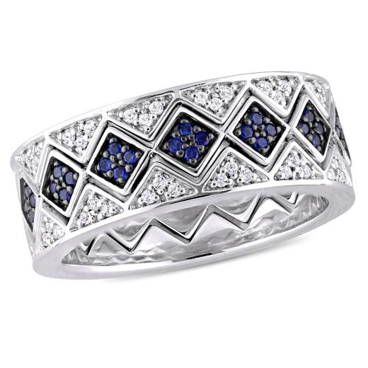 This geometric stackable ring set is crafted in sterling silver with black rhodium and features dazzling created blue and white sapphires set in a unique geometric design. Whether worn together or apart, this modern ring set is sure to make a versatile addition to any jewelry collection.