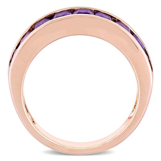 Add some vibrant color to your look when you wear this unique African-Amethyst Semi-Eternity Anniversary Ring. Mounted in glittering rose rhodium-plated sterling silver, it features nine baguette-cut, channel-set African-amethyst gemstones (5 x 3mm) resting in a line forming a semi-eternity style. This gemstone ring has been enhanced with a beautiful high polish finish and is an ideal choice for today's contemporary woman. Gift this gemstone anniversary ring as a wonderful token of love and make her feel special.
