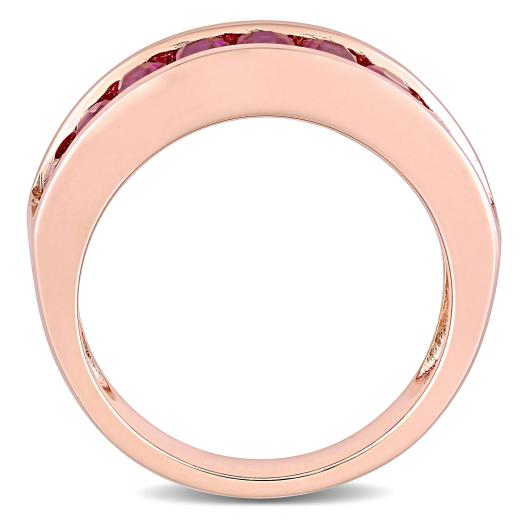 Stand out from the rest as you wear this beautiful Created Ruby Semi-Eternity Anniversary Ring. Mounted in glittering rose rhodium-plated sterling silver, it features nine baguette-cut, channel-set created ruby gemstones (5 x 3mm) rested in a line forming a semi-eternity style. This gemstone ring has been enhanced with a high polish finish. Sweep off her feet when you gift her this stunning and colorful gemstone anniversary ring.