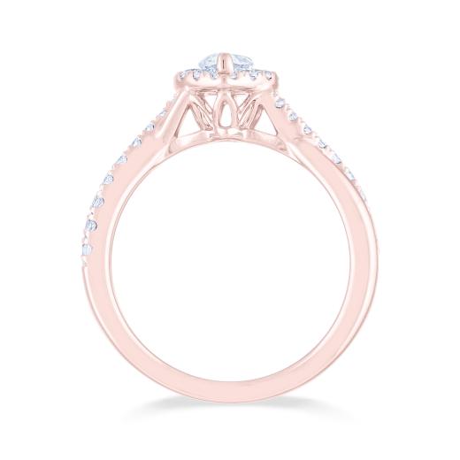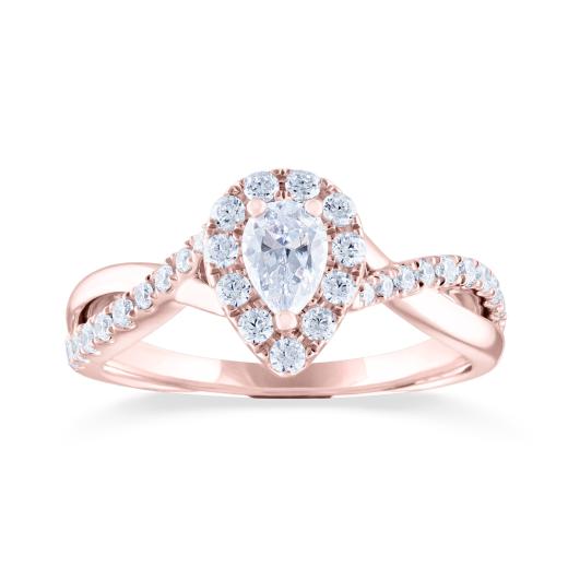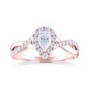 The beauty of love sparkles forever within this remarkable .70ctw rose gold bridal ring from Diamond Revelations. Featuring a dazzling .30ct pear shaped diamond at its centre, this ring sparkles with a round diamond halo and a wave of diamonds along its twisted band.