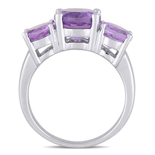 This beautiful three-stone ring from the Collection features three round-cut amethyst stones. This gorgeous ring is crafted of fine sterling silver and glimmers with a highly polished finish.