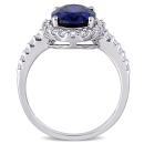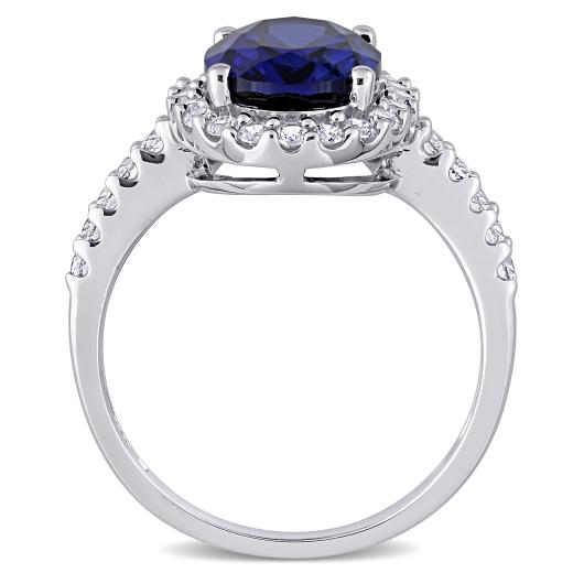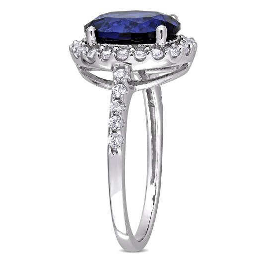 Radiate your feminine glow with this elegant Created White and Blue Sapphire Halo Ring. Mounted in lustrous white gold, it features an oval-cut, prong-set created blue sapphire gemstone (10 x 8mm) at the center with 30 round-cut, buttercup-set created white sapphire gemstones forming a halo and resting along band. Enhanced with a high polish finish, this gemstone halo ring makes the perfect addition to any jewelry collection.