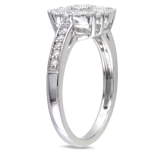 This gorgeous ring features round-cut created white sapphires that resemble diamonds. The ring is set in sterling silver and is adorned by miligrain detailing.