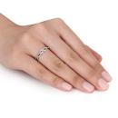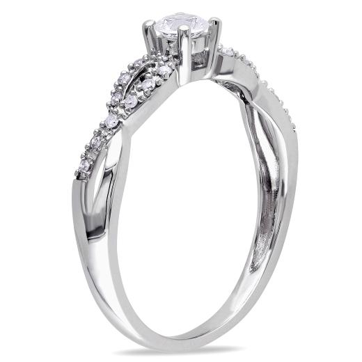 This gorgeous double infinity ring features a round-cut created white sapphire center stone and 20 round white diamond side stones. This stylish ring is crafted of gleaming 10-karat white gold with a high polish finish.