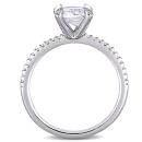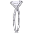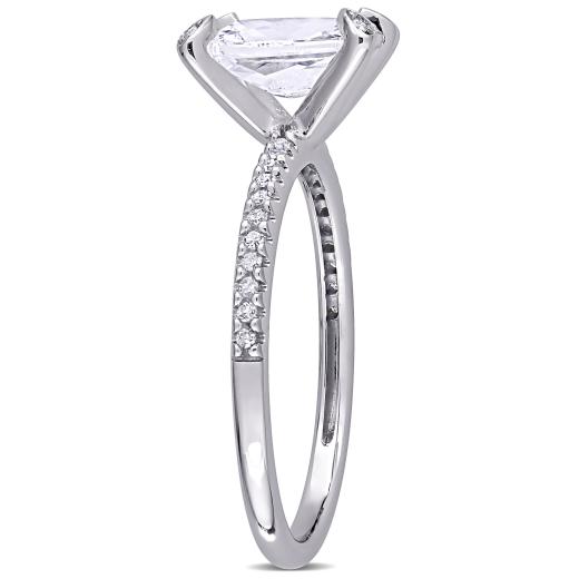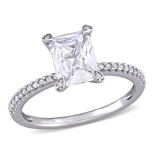 This modern and sophisticated created white sapphire and diamond engagement ring is crafted in white gold and features an octagon-cut, prong-set created white sapphire gemstone at the center with a total of 26 round-cut, buttercup and pave-set diamonds adding a touch of shimmer along each prong as well as along its delicate band. A modern take on a classic bridal style this gemstone and diamond ring is a perfect choice for the woman you love as you celebrate this special milestone and begin the next chapter of your lives together.