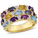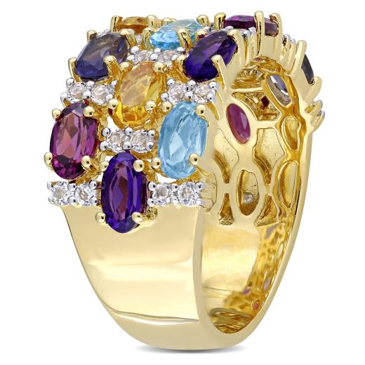 This vibrant multicolor colored multi-gemstone anniversary band is crafted in yellow plated sterling silver and features a total of 13 oval-cut multi-color gemstones carefully set in a unique triple row mosaic style paired with a total of 28 round-cut white topaz stones exhibiting elegance and sophistication at its finest. With exquisite colors and a brilliant shine, this rainbow gemstone ring is sure to make a standout addition to any jewelry collection.