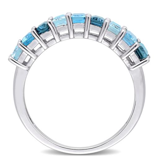 Impress your loved one with this Blue Topaz Semi-Eternity Ring. Mounted in glittering sterling silver, it features nine baguette-cut, prong-set shiny Swiss, London and sky- blue topaz gemstones (5 x 2.5mm) resting in a row to form a semi-eternity style. Enhanced with a high polish finish, this gemstone anniversary ring makes a valuable and timeless addition to any jewelry collection.