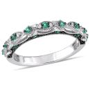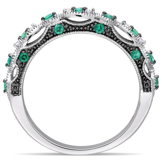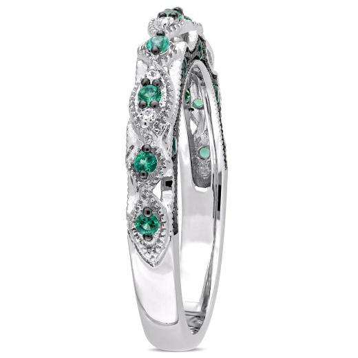 This charming ring features nine round-cut created emerald stones with round white diamond accents. This magnificent anniversary band is crafted in glittering 10-karat white gold and is enhanced with a milgrain finish.