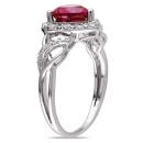 This lovely ring features a heart-cut created ruby center stone and round white diamond side stones. This beautiful ring is crafted of fine sterling silver with a high polish finish.