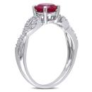 This glamorous ring features a round-cut created ruby center stone and white diamond side stones with an infinity motif set in 10-karat white gold. The ring is enhanced with high polish finish.