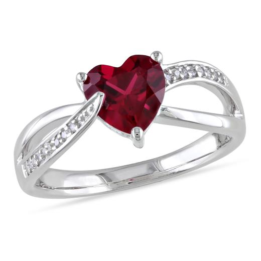 This attractive ring features a heart-cut created ruby center stone with round white diamond side stones set in sterling silver. This ring glimmers with a high polish finished.