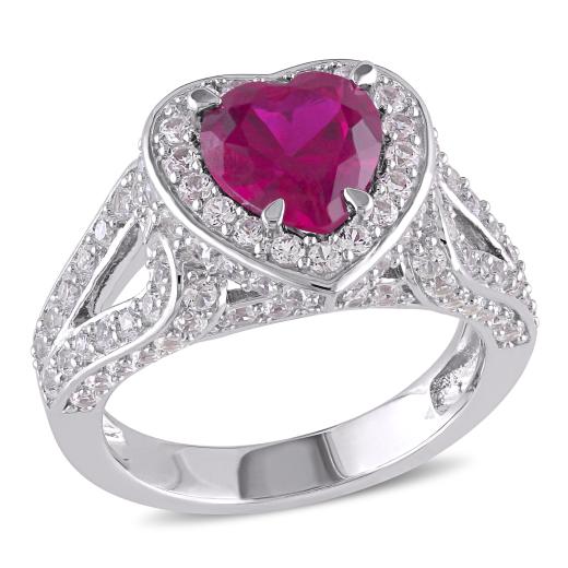 This stunning ring features a heart-cut created ruby center stone surrounded by created white sapphire side stones set in sterling silver. This lovely heart ring is enhanced with a high polish finish.