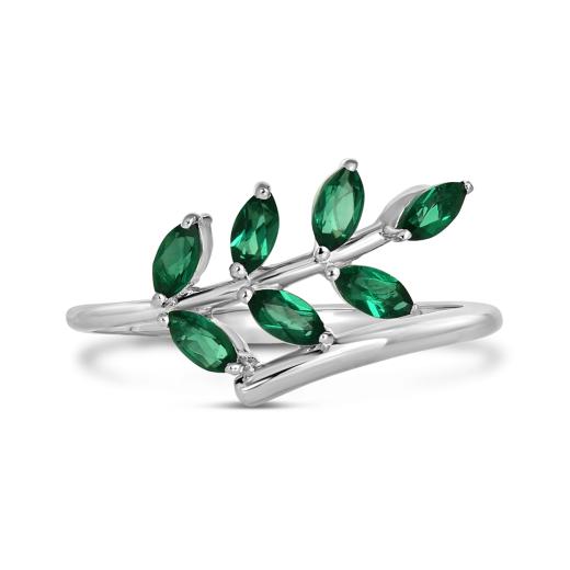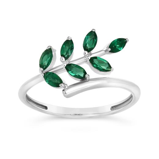 This trendsetting leaf shaped ring is crafted in lustrous sterling silver and features 7 marquise-cut created emeralds clustered in a unique leaf inspired design. Instantly elevate any ensemble with this sumptuous gemstone ring.