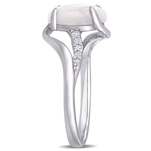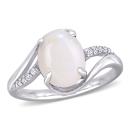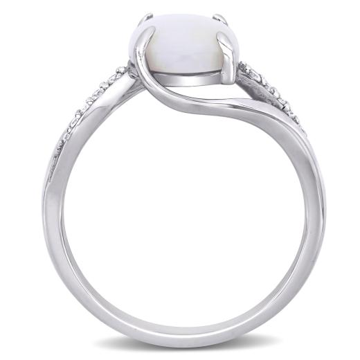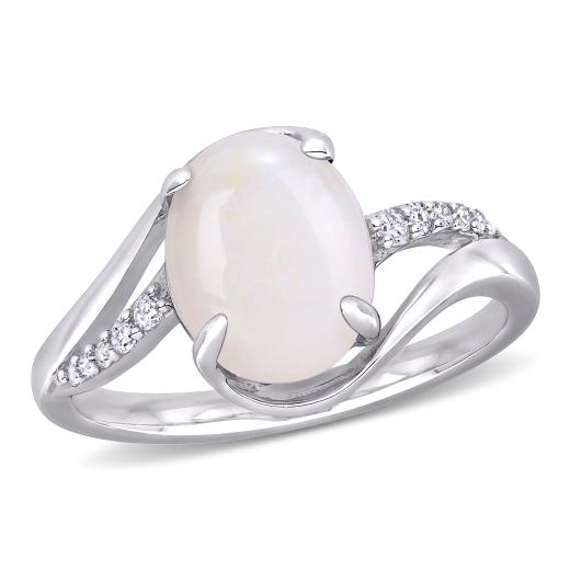 This trendsetting opal and diamond bypass ring is crafted in lustrous sterling silver and features an oval-cut, prong-set opal gemstone at its center with ten round-cut, prong-set diamonds augmented in a unique bypass design. Enhanced with a high polish finish, this gemstone and diamond ring is the perfect addition to any jewelry collection. Pair this alluring ring with any ensemble and instantly add a touch of elegance and sophistication to your look.