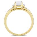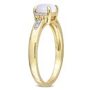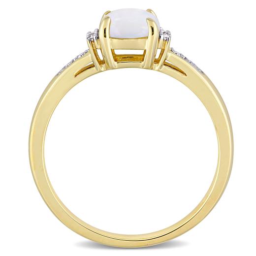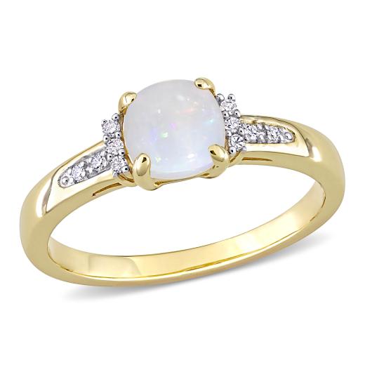 This charming halo engagement ring is crafted in 10-karat yellow gold. This classic wedding ring features a single cushion cabochon-cut, glittering opal gemstone along with 10 round-cut sparkling diamonds beautifully embellished on it. Enhanced with a high polish finish, this beautiful gemstone and diamond ring is a great addition to any jewellery collection. This style represents the combination of natural sophistication and beauty.