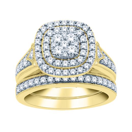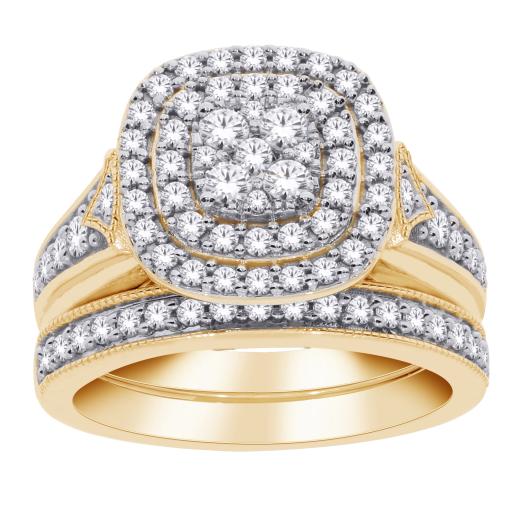Sweep her off her feet with this show-stopping 1ctw bridal set. Set into exquisite 10k yellow gold, this bridal set is designed to sparkle for a lifetime of love. Featuring a cluster of sparkling diamonds at the centre and a dazzling double halo, this bridal set also shines with sparkling diamonds along the shoulders of the striking bridal ring. To complete this one-of-a-kind bridal set, a matching diamond wedding band glitters with additional diamonds.