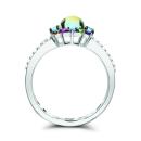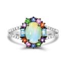 This trendy multi-gemstone ring is crafted in sterling silver and centre set with a beautiful genuine jelly opal. The opal is surrounded by blue topaz, amethyst, tsavorite garnet, and blue, pink and orange sapphire. Accenting the sides of the ring are dazzling white topaz gemstones. Instantly add a touch of glamour and colour to any ensemble with this stunning ring.