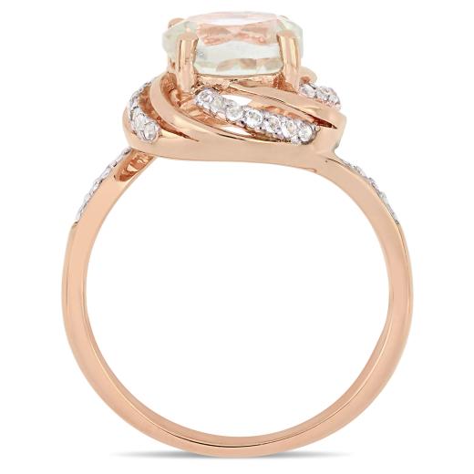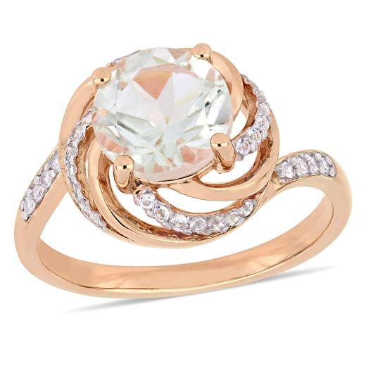 This gorgeous green quartz, white topaz and diamond accent swirl halo ring is crafted in rose plated sterling silver and features a round-cut green amethyst at its centre with 28 white topaz stones and eight diamonds studding its unique swirl halo design. This versatile gemstone and diamond ring is sure to make a perfect elegant and sophisticated addition to any jewellery collection.