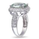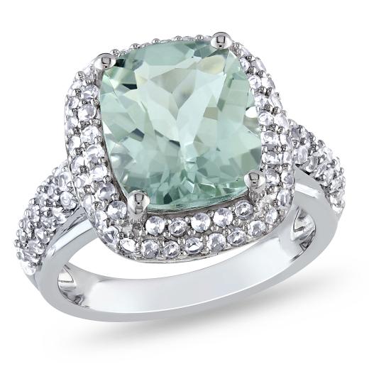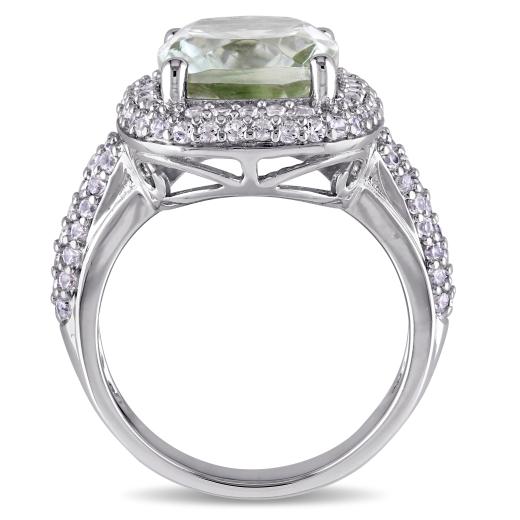 This elegant cocktail ring features is cushion-cut green quartz and round-cut created white sapphire set in sterling silver. The beautiful ring is glimmers with highly polished finish.