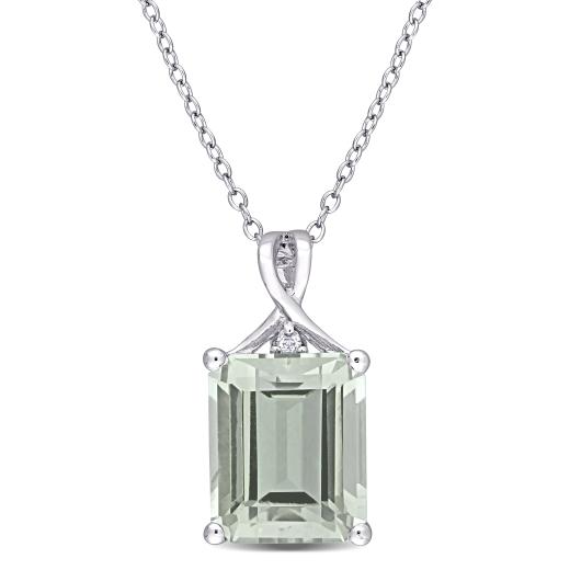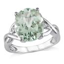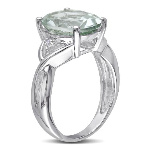 This graceful cocktail ring features an oval-cut green quartz centre stone flanked by two round white diamond side stones. This glamorous ring is crafted of gleaming sterling silver with a high polish finish.