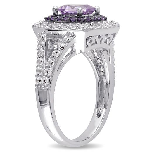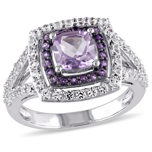 This pretty cocktail ring features a cushion-cut rose de France centre stone enhanced by a halo of 20 round-cut African amethyst side stones with 48 ascending round-cut created white sapphires set in sterling silver. This exquisite ring is enhanced with a high polish finish.