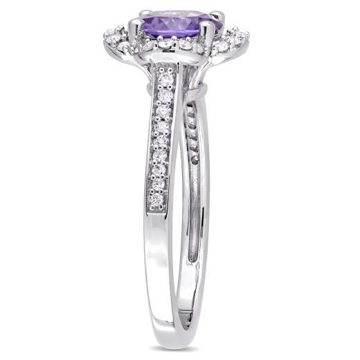 This stunning ring is crafted in 14-karat white gold and features a lovely amethyst and diamond quatrefoil halo design. This beautiful ring is a perfect choice either for yourself or someone you love.