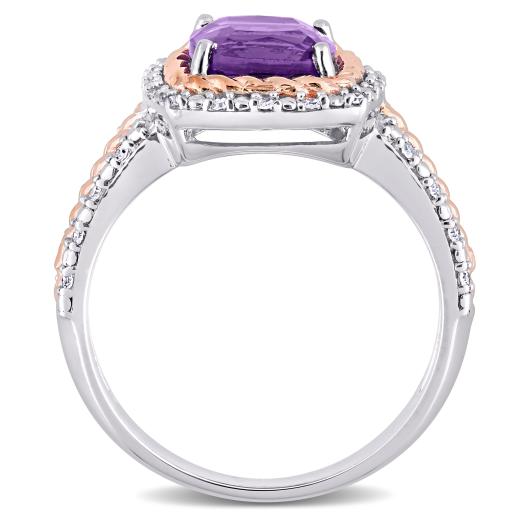 This radiant multi-row halo engagement ring is crafted in two-tone white and rose plated sterling silver. This charming wedding ring features a cushion-cut amethyst centre stone surrounded by a halo of round white diamonds and additional diamonds beautifully embellished on the multi-row band. Pair this alluring rope design gemstone and diamond ring with any casual or business attire and look gorgeous. Enhanced with a high polish finish, this cocktail ring is a beautiful addition to any jewellery collection.