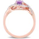 This sophisticated halo infinity engagement ring is crafted in lustrous 10-karat rose gold. This modern crossover wedding ring features an oval-cut amethyst centre stone surrounded by a halo of round-cut sparkling diamonds and additional diamonds decorating the split shank band. Celebrate your love and devotion with this gorgeous bridal ring. Elegance and style at its finest, this birthstone gemstone and diamond ring is sure to make a standout addition to any jewellery collection.