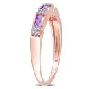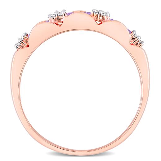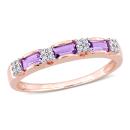 This fabulous stacking three-stone anniversary ring is crafted in 10-karat rose gold. This pretty wedding ring features alternating baguette-cut amethyst and round-cut white topaz gemstones. Enhanced with a high polish finish, this stackable eternity ring is the perfect addition to any jewellery collection. Whether worn as an anniversary band, wedding band or simply a gorgeous gemstone accessory, this ring is a great gift for a woman with a classic and trendy sense of style.