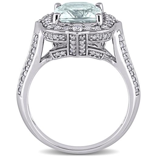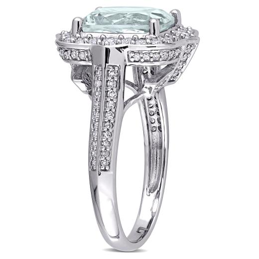 This beautiful halo engagement ring is crafted in 14-karat white gold. This bold wedding ring features a cushion-cut, prong-set glowing aquamarine gemstone at the center surrounded by 112 round-cut, pave-set shimmering white diamonds, to add sparkle and elegance to your look. This cocktail ring is enhanced with high polish finish. Show that special someone how much you love them with this gorgeous gemstone and diamond ring and make her feel like princess.