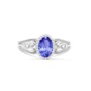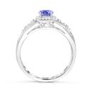 A stunning oval cut tanzanite is surrounded by a halo of sparkling white diamond in this gorgeous ring that is crafted in cool sterling silver. This ring is a guaranteed showstopper.